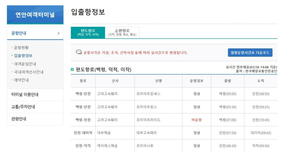 연안여객터미널 '입출항정보' 페이지에서