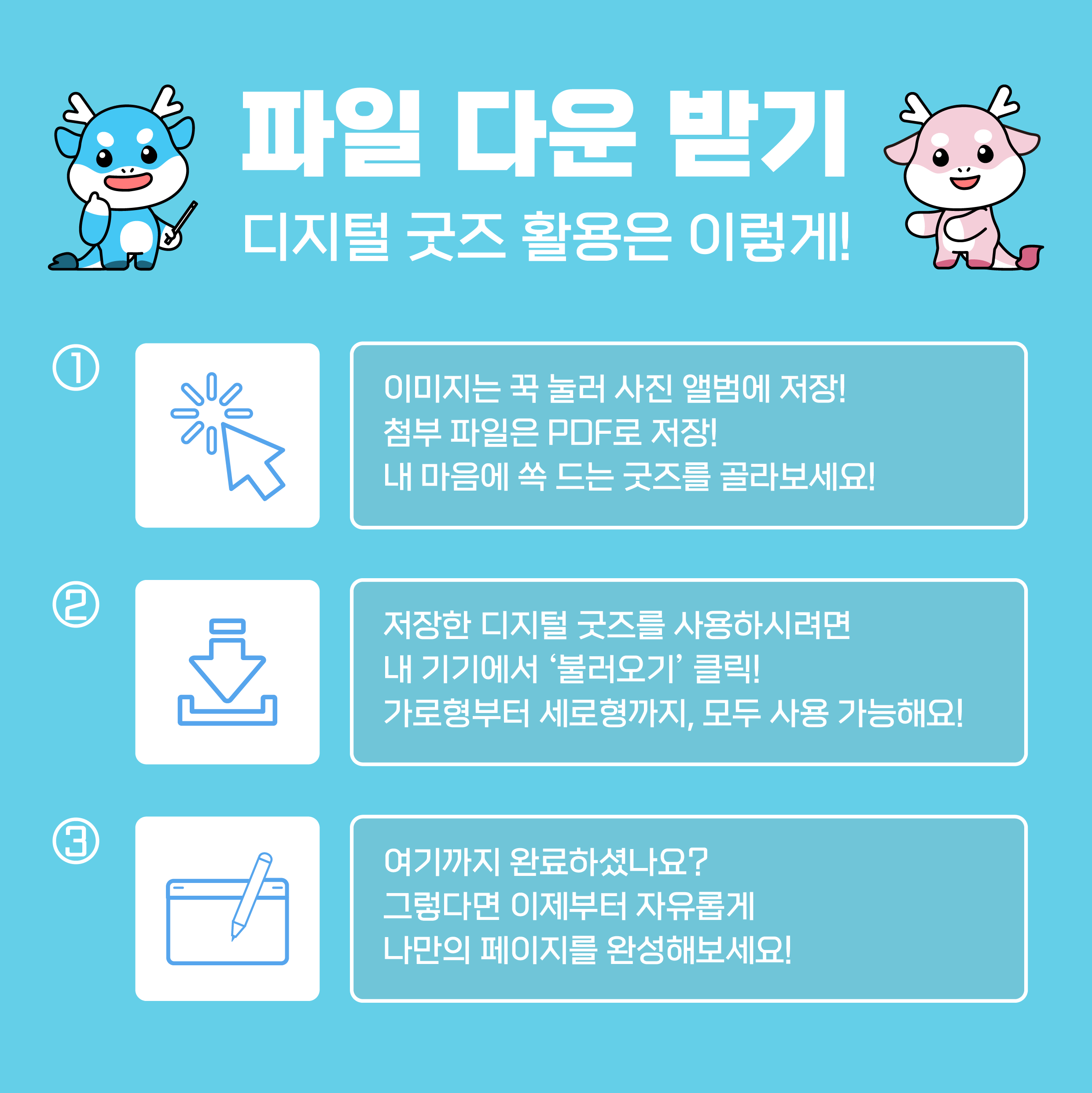 1. 이미지는 꾹 눌러 사진 앨범에 저장! 첨부파일은 PDF로 저장! 내 마음에 쏙 드는 굿즈를 골라보세요!
