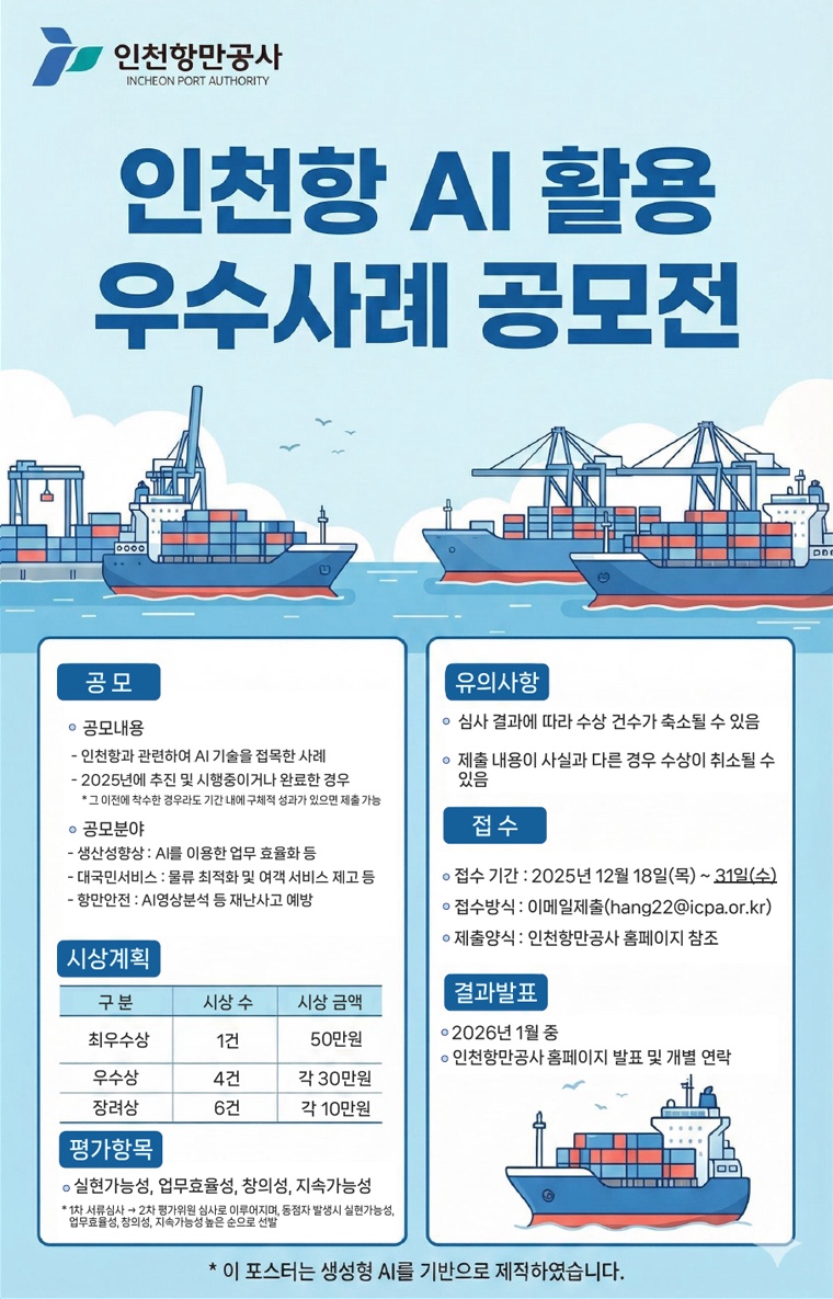 | 2025년 인천항 혁신을 위한 AI 활용 우수사례 공모전 개최! (1) | 2025.12.18 |