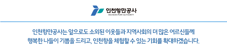 ○ 인천항만공사 안길섭 일자리사회가치실장은 “인천항만공사는 항만 인근 지역주민들과 상생하기 위한 활동을 지속하고 있다”면서 “앞으로도 소외된 이웃들과 지역사회의 더 많은 어르신들께 행복한 나들이 기쁨을 드리고, 인천항을 체험할 수 있는 기회를 확대하겠다”고 말했다.