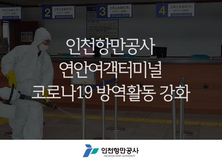 ○ 인천항만공사(www.icpa.or.kr, 홍경선 사장 직무대행)는 코로나19 대응이 심각단계로 격상됨에 따라 항만을 통한 확산 방지를 위해 연안여객터미널에 대한 방역을 강화한다고 밝혔다.