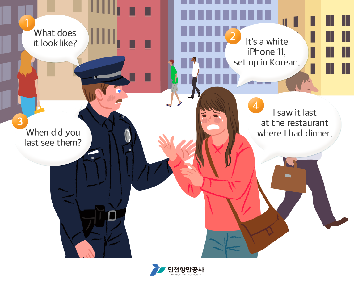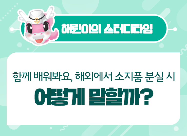 안녕하세요! 인천항만공사 해린이에룡! 여러분은 혹시 여행지에서 소중한 물건을 분실해 마음아팠던 경험 있으신가요? 해린이는 몇 년전 여행지에서 핸드폰을 잃어버려 정말 속상했던 적이 있었어요. 경찰서에 가서 분실물 신고를 하자니 영어로 말하기가 겁나서 머뭇거렸던 기억이 있답니다. 그래서 오늘은 해린이가 혹시나 해외에서 귀중품을 잃어버려 과거의 해린이처럼 마음 아프신 분들이 없도록 스터디타임을 준비해봤어요. 여행 시 귀중품 분실 등으로 경찰서에 방문해야 할 경우 사용하면 좋을 영어 표현을 미리 익혀볼까룡!