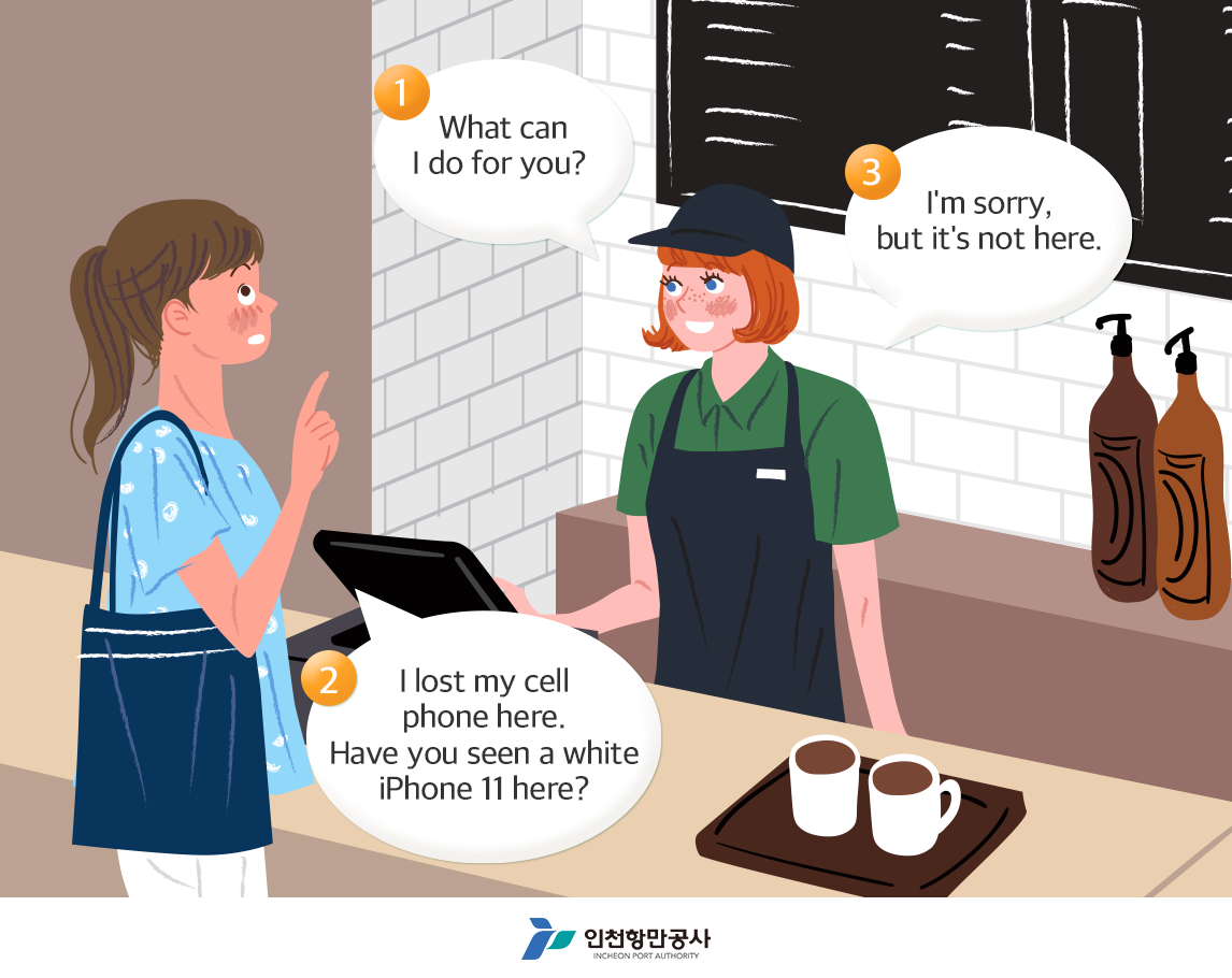 B: I lost my cell phone here. Have you seen a white iPhone 11 here? (여기서 핸드폰을 분실하였는데, 혹시 여기서 흰색 아이폰 11을 본 적 있나요?)