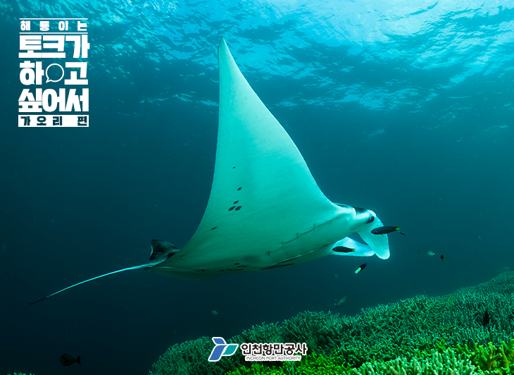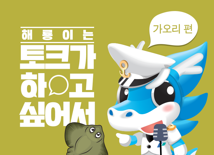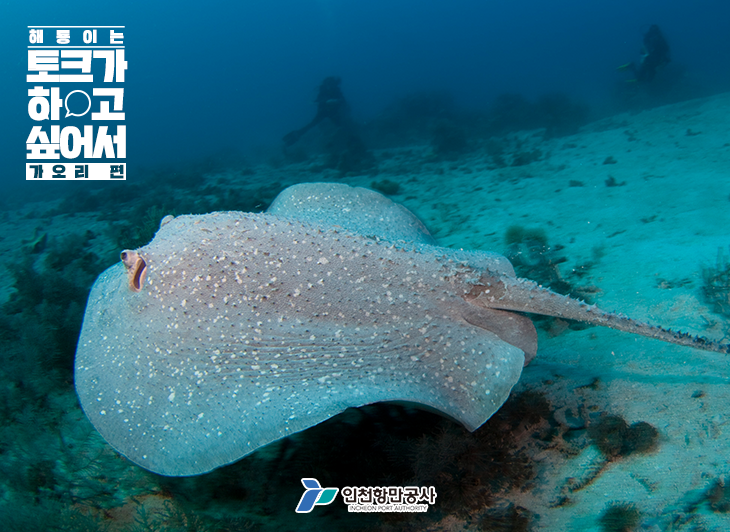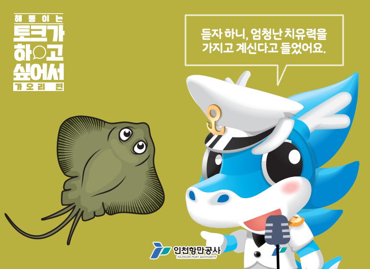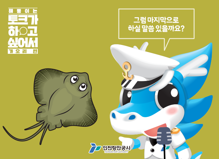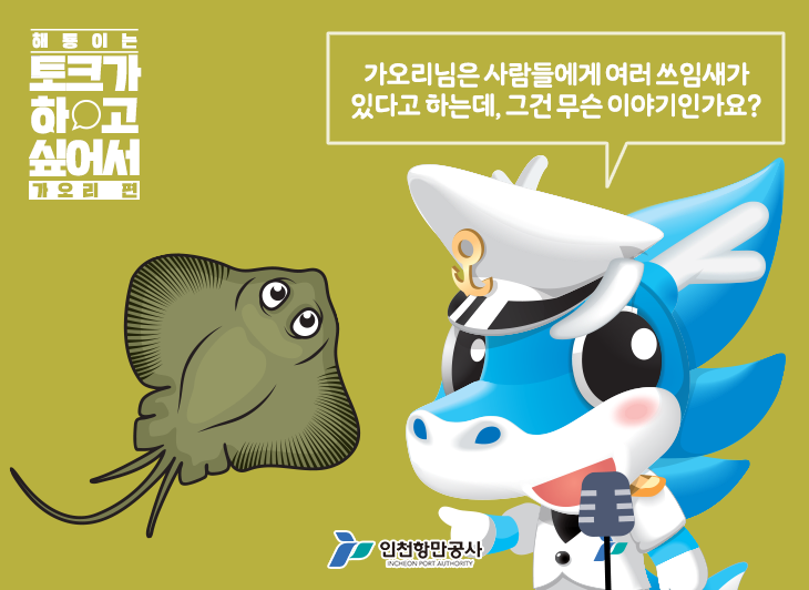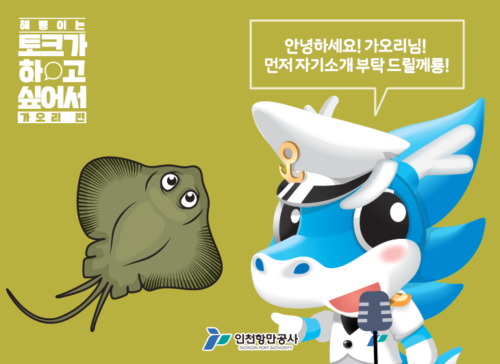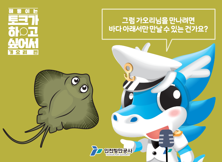 안녕하세룡! 인천항만공사 해룡이에룡! 매주 특별한 바다생물을 만나보는 해룡이는 토크가 하고 싶어서 시간! 오늘은 특이한 생김새를 가지고 있는 바다생물을 만나보았는데요. 바로 ‘가오리’입니다. 지금 같이 만나볼까요?