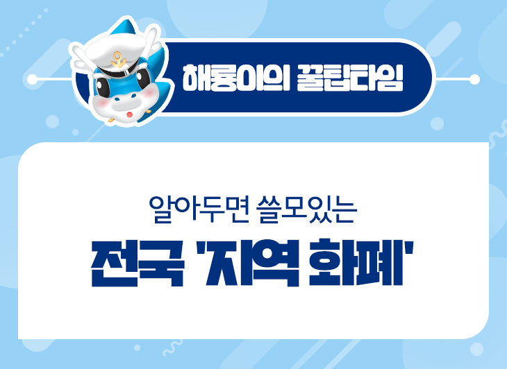 안녕하세룡~ 여러분에게 꿀팁을 알려드리는 꿀팁전도사 해룡이에요! 코로나 19로 인해 정부 차원에서 가계 및 소규모 영세 업자들을 위한 대책을 내어놓았습니다. 바로 재난소득지원금! 모두 잘 받으셨나요? 재난소득지원금을 신청할 때 본인의 신용카드 또는 지역 화폐를 통해 받을 수 있도록 설정되었는데요. 지역 화폐, 상당히 생소하지만 어디선가 들어봤던 말 같습니다. 오늘은 해룡이가 전국에서 활용하고 있는 지역 화폐의 종류를 소개해 드리도록 할게요. 함께 알아볼까요?