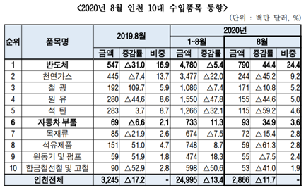 그 외에도 인천항에서는 자동차, 화장품, 석유, 원료 등의 품목이 수출되고 있다는 것을 알 수 있습니다.
