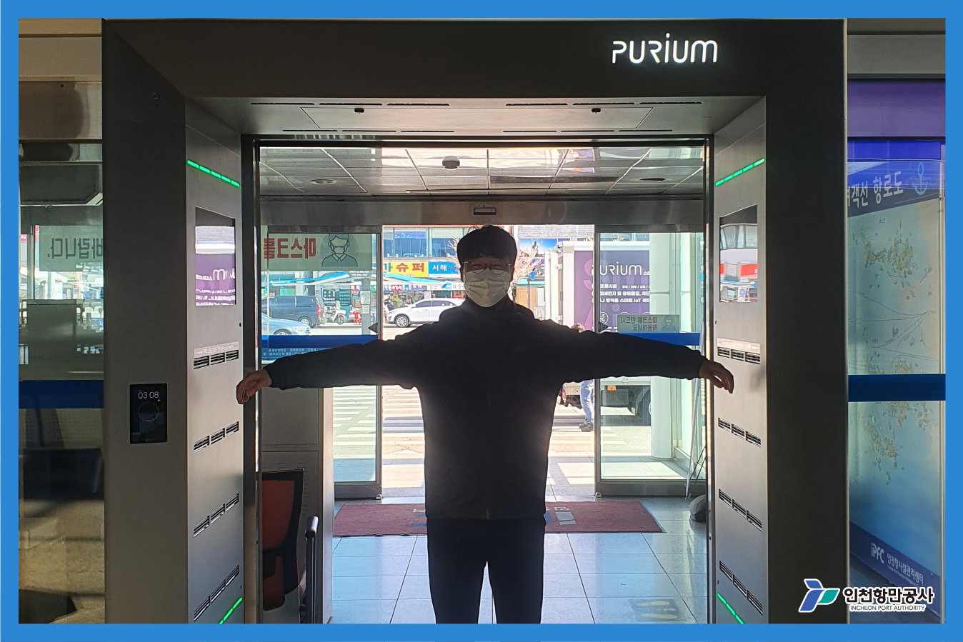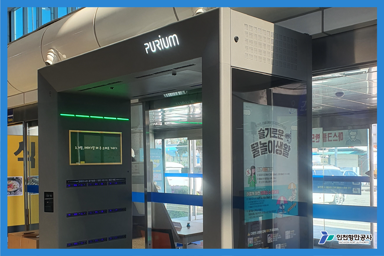 첫 번째, ‘스마트 에어샤워’를 국내 항만 최초로 도입했습니다(짝짝짝)! 인천항 연안여객터미널 1번 출입구에 설치된 스마트 에어샤워는 사물인터넷을 활용하여 각종 미세먼지와 유해 물질을 차단 및 제거하는 기능을 합니다.
