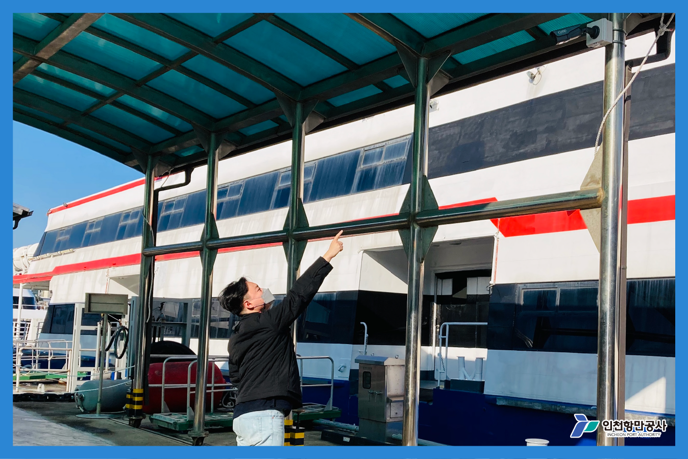 두 번째, 인천항 연안여객터미널 부잔교 시설에 ‘스마트 안전관리시스템’를 시범 운영 중입니다(짝짝짝)! 해당 시스템은 시설물의 철저한 관리와 재난사고 발생에 대한 신속한 대응을 위해 도입된 기능인데요. IoT 센서뿐 아니라 인공지능 영상분석기술까지 접목한 신기술이 반영되어 있답니다.
