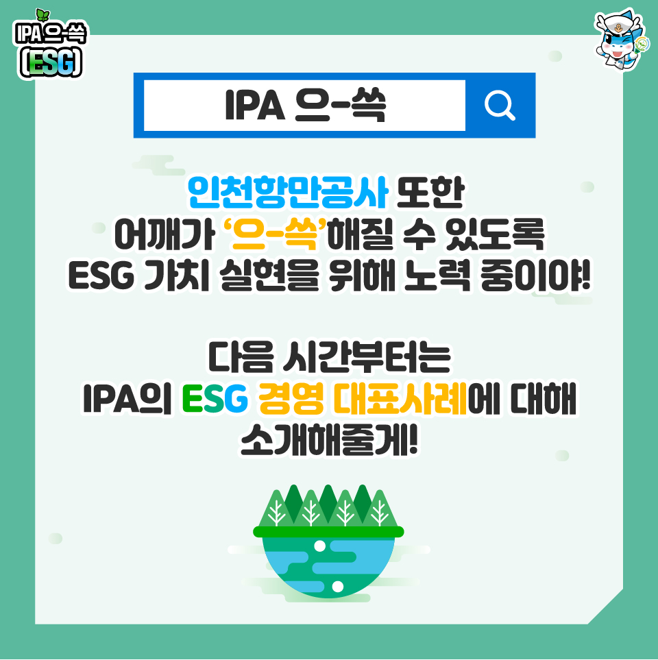 인천항만공사 또한, ESG 가치 실현을 위해 적극 노력 중인데요. ESG 전략을 마련하여 지속적인 윤리경영을 실천함으로써 사회적 책임을 다하는 것이 인천항만공사의 포부랍니다! 다음 이 시간에는 인천항만공사의 다양한 ESG 경영 대표사례를 소개해드릴 예정입니다. 모두들 많은 기대 부탁드려룡~!