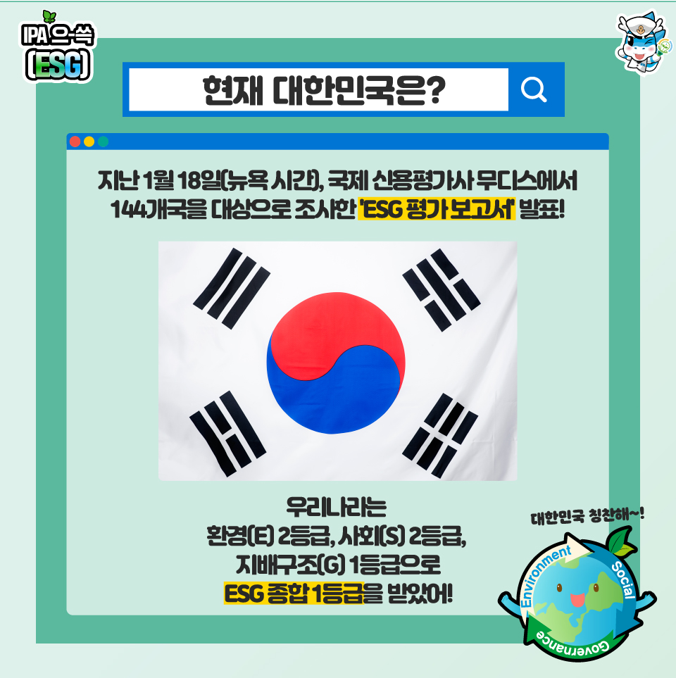 지난 1월 18일(뉴욕 시간), 국제 신용평가사 무디스에서 144개국을 대상으로 조사한 'ESG 평가 보고서'를 발표했습니다. 각국의 환경과 사회, 지배구조와 더불어 국가신용등급에 대한 ESG의 종합적인 영향을 평가한 것인데요. ESG 각 분야별로 5개 등급 척도로 나눠 평가한 결과, 대한민국은 ESG 1등급으로 선정되었답니다. (짝짝짝) 평가 결과를 살펴보면, 환경(E) 2등급, 사회(S) 2등급, 지배구조(G) 1등급으로 ESG 종합 1등급을 받은 대한민국! 정말 대단하죠?