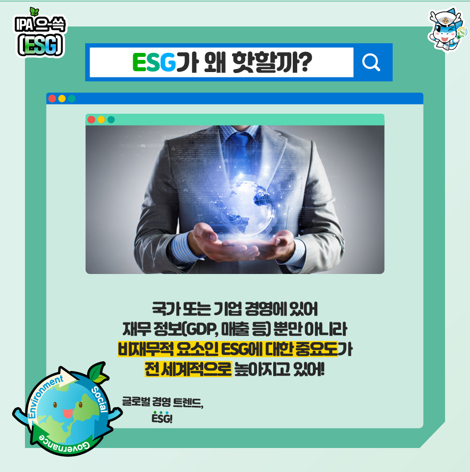 국가 또는 기업 경영에 있어 재무 정보(GDP, 매출 등)뿐 아니라 비재무적 요소인 ESG에 대한 중요도가 전 세계적으로 높아지고 있습니다! ESG경영을 통해 기업의 투명성을 적극 알리고, 사회에 긍정적인 영향력을 끼치는 것인데요. 이제 ESG는 기업경영에 있어 선택이 아닌 필수가 되었답니다!
