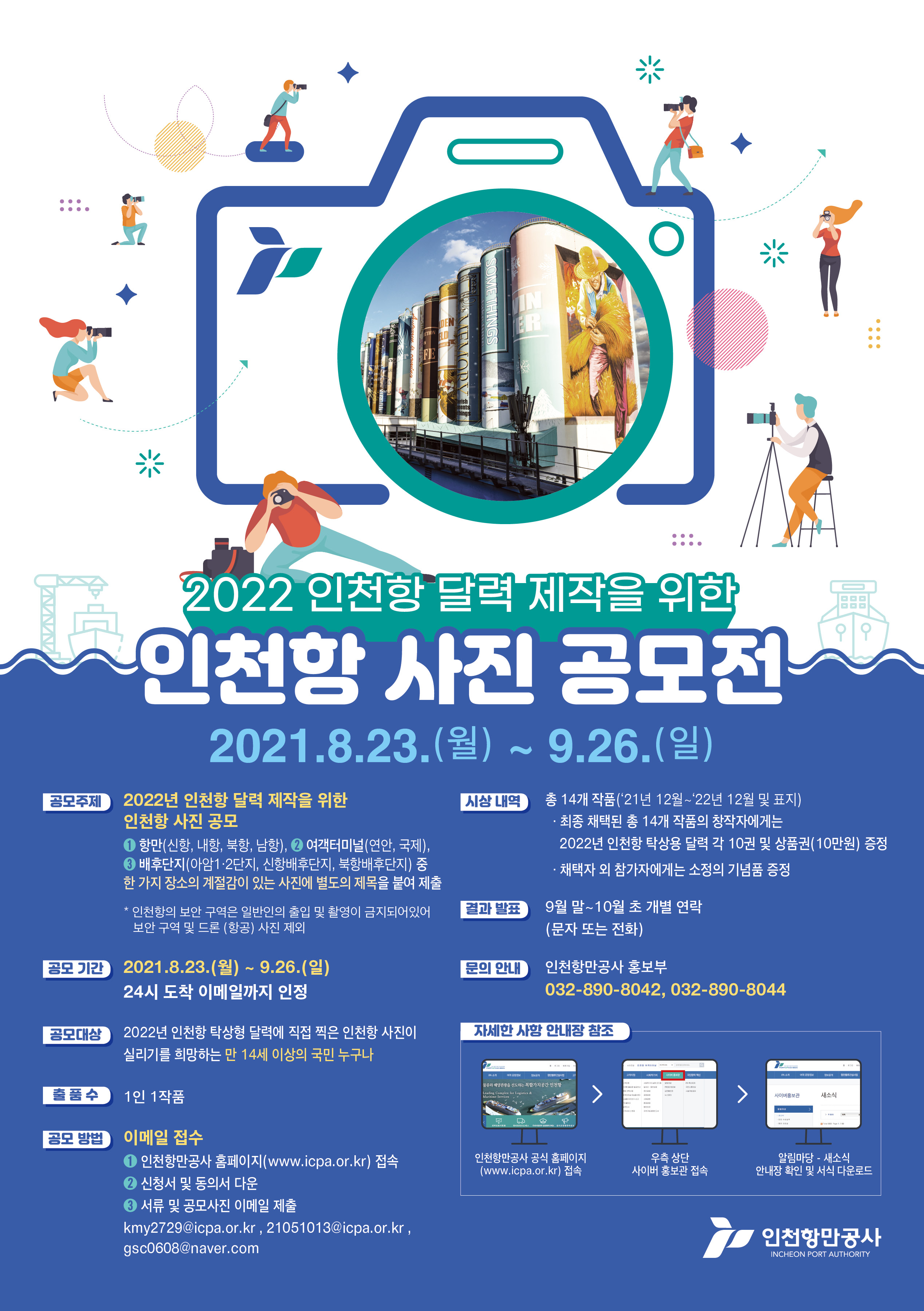 참여를 원하시는 분들은 8월 23일 월요일부터 9월 26일 일요일까지 신청하시면 됩니다. 단, 마감일인 9월 26일 24시 도착 이메일 건까지만 인정이 되니 유의 부탁드립니다. 출품은 1인당 1작품만 가능하며, 신청은 인천항만공사 홈페이지에서 신청서 및 동의서를 다운받은 후 서류 및 공모사진이 담긴 이메일을 kmy2729@icpa.or.kr, 21051013@icpa.or.kr, gsc0608@naver.com 으로 보내주시면 됩니다.