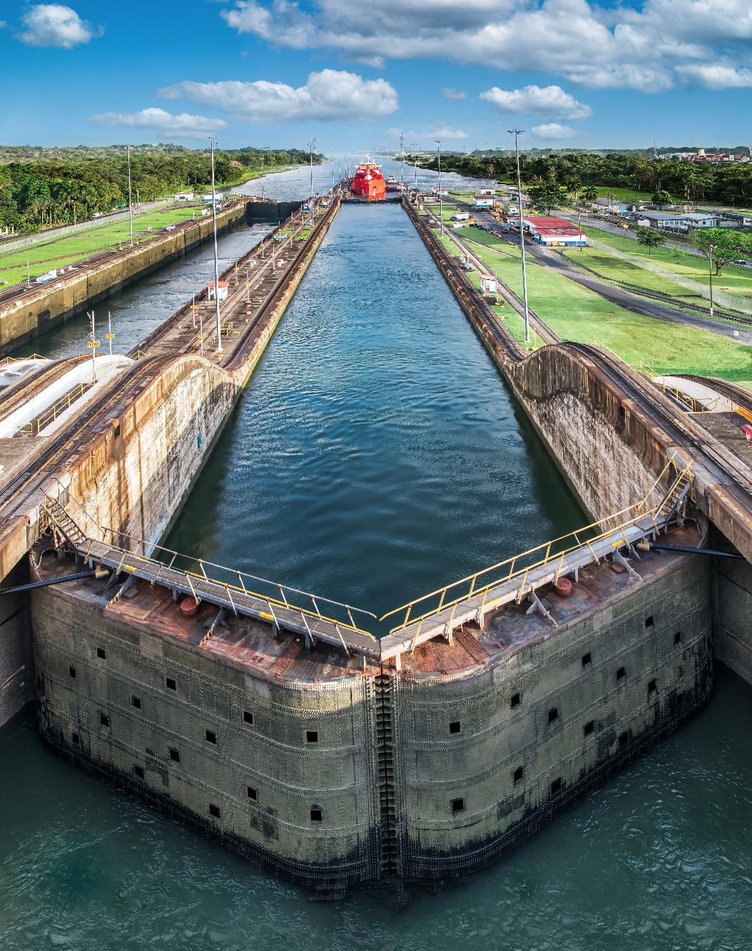 태평양과 대서양을 잇는 파나마 운하! 파나마 운하는 북아메리카 대륙과 남아메리카를 연결하는 파나마 지협을 종단하고 있습니다. 파나마 운하의 길이는 약 80~82km, 폭은 약 192~222m, 깊이는 약 14m로 대서양 연안의 콜론에서 태평양 연안의 발보아까지 자리하고 있는데요. 파나마 운하가 태평양과 대서양을 관통하면서, 남아메리카를 우회하여 운행하던 선박들의 이동이 훨씬 간편해졌답니다. 바로 파나마 운하를 통해 이동하면 약 1만 5,000km를 단축할 수 있기 때문입니다.