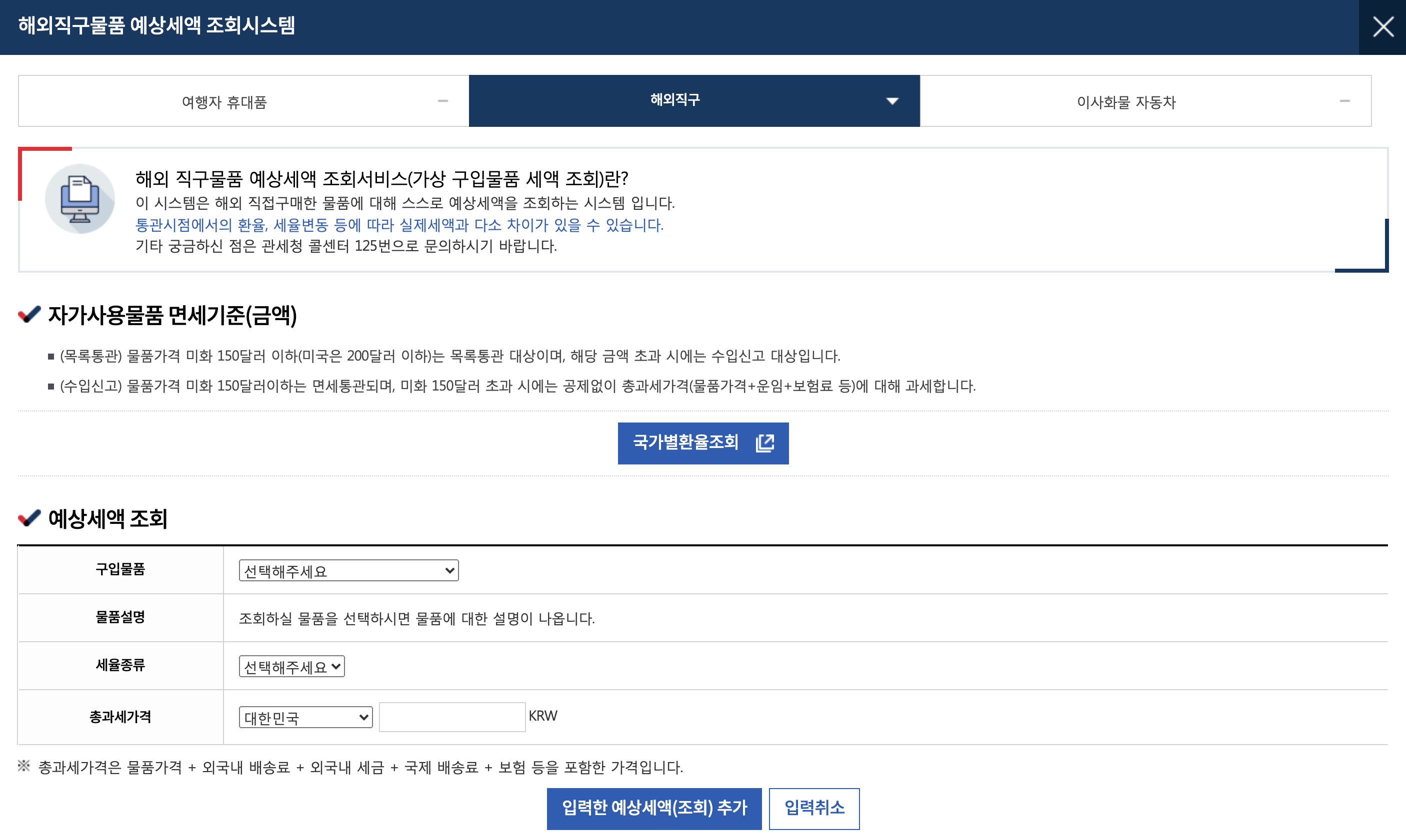 해외직구물품 예상세액 조회서비스는 말 그대로 해외에서 구매한 물품에 대해 스스로 예상세액을 조회할 수 있는 시스템입니다. 구입물품, 물품설명, 세율종류, 총과세가격 등을 통해서 예상세액을 사전에 확인할 수 있답니다.