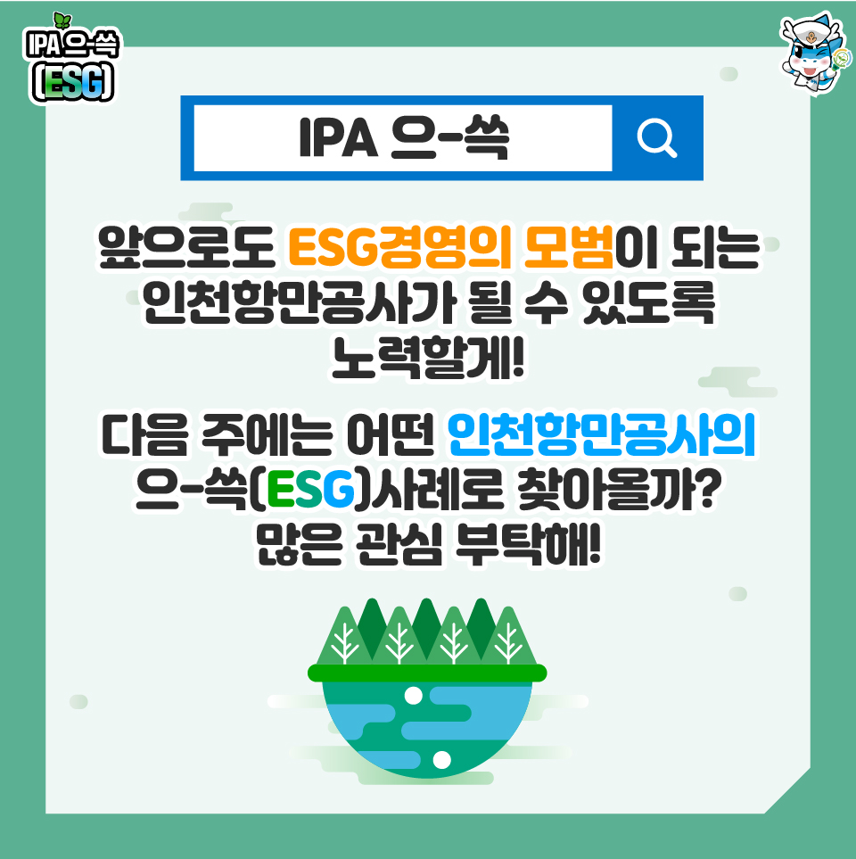 인천항만공사는 ESG의 중요성을 인지하고, 이를 행동으로 실천하고 있는데요. 모두가 상생하고 성장할 수 있는 좋은 사례들을 적극 발굴하고, 실행하며 ESG경영의 모범이 되는 인천항만공사가 될 수 있도록 노력하겠습니다! 앞으로도 인천항만공사의 ESG경영 실천에 아낌없는 응원과 관심 부탁드립니다! 그럼 다음 주에도 인천항만공사의 ESG경영 사례로 찾아뵙겠습니다:)