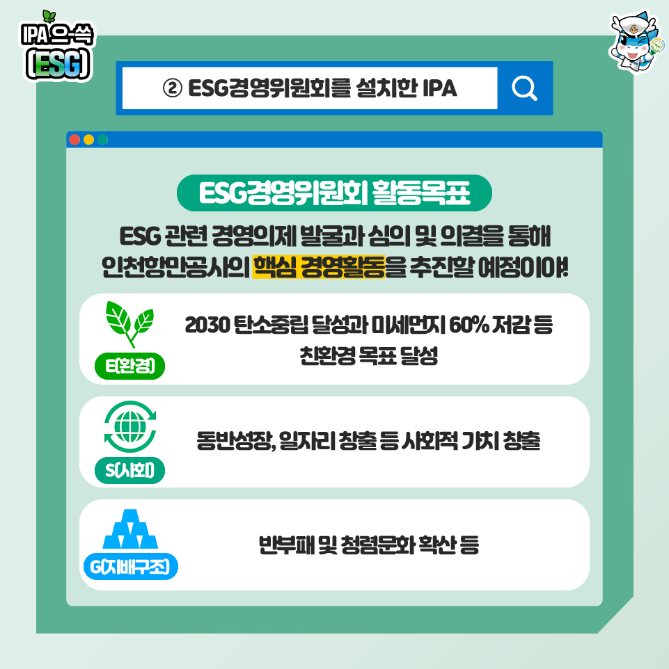 ESG경영위원회는 다양한 ESG 관련 경영의제 발굴과 심의 및 의결을 통해 인천항만공사의 핵심 경영활동을 추진할 예정인데요. ESG경영위원회는 ESG의 각 분야별 핵심 활동에 대한 노력을 아끼지 않을 계획이랍니다. 세부적으로는 E(환경) 분야에서 2030년까지 인천항만공사 자체 탄소중립 달성과 미세먼지 60% 저감 등 친환경 목표 달성, S(사회) 분야에서는 동반성장, 일자리 창출 등 사회적 가치 창출, G(지배구조) 분야에서는 반부패 및 청렴문화 확산 등의 목표를 수립하여 실천할 계획입니다.