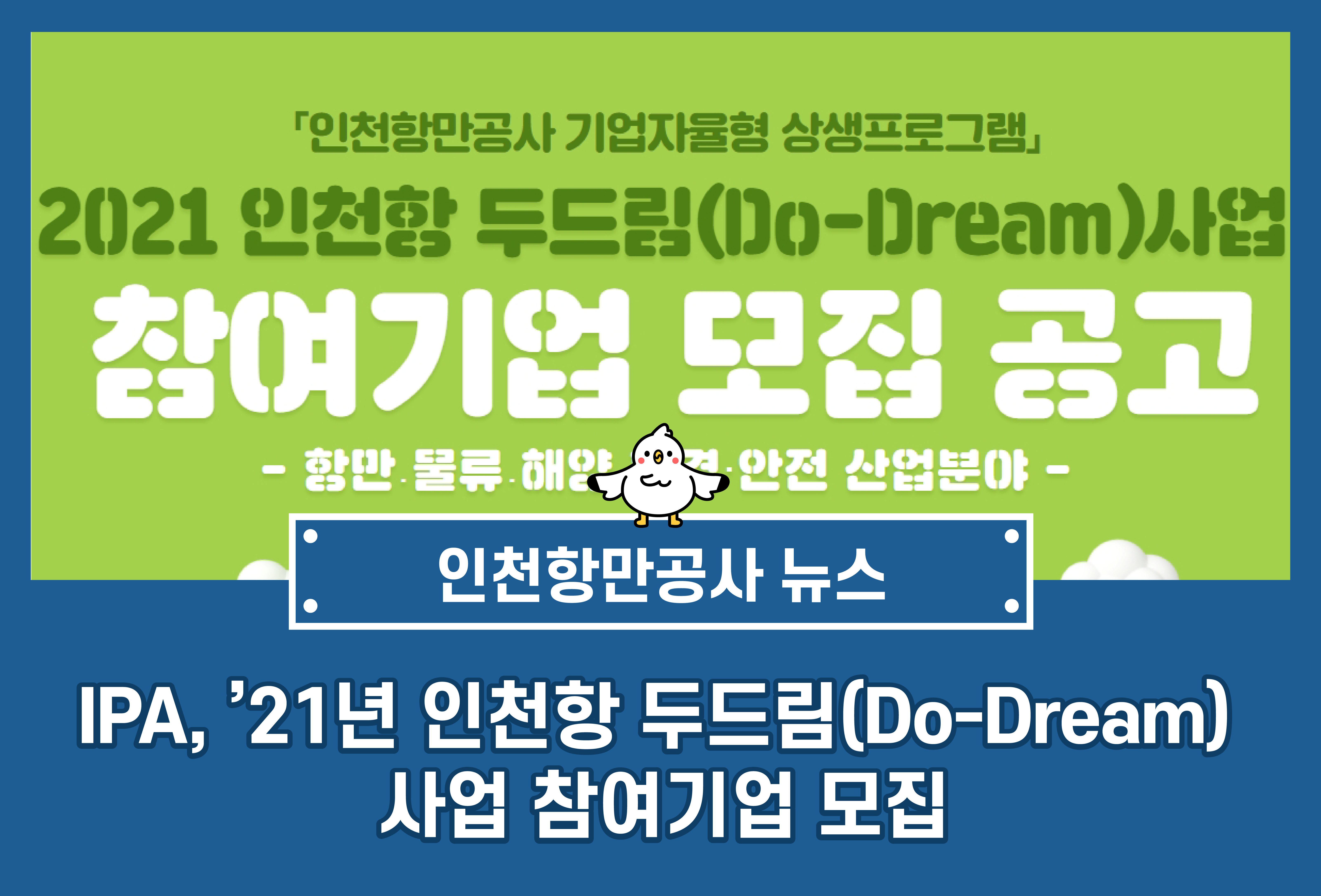 ○ 인천항만공사(IPA, 사장 최준욱)는 해운·항만·물류 분야 신규 창업기업을 발굴하고, 우수 초기 창업기업의 안정적인 사업 수행을 지원하기 위해 ‘2021년 인천항 두드림(Do-Dream)’ 사업 참여기업을 모집한다고 24일 밝혔다.