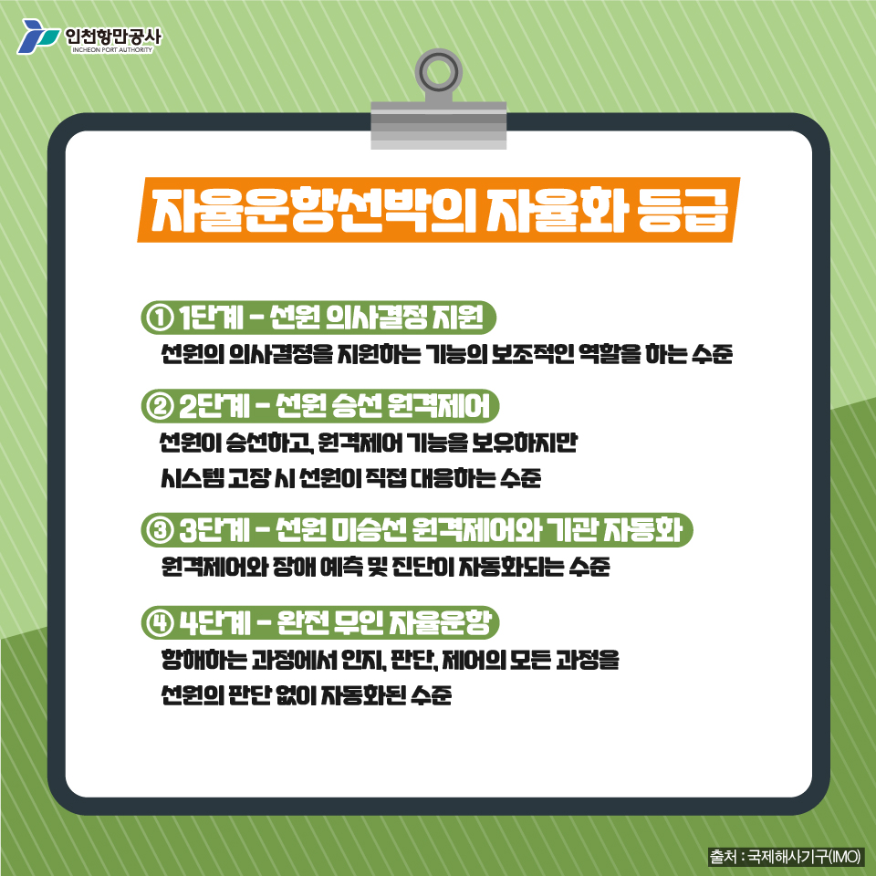 국제해사기구(IMO)에서는 자율운항선박의 시스템 권한과 능력에 따라 단계적으로 개념들을 정의하고 있는데요. 크게 4단계의 수준으로 자율화 등급을 구분하고 있답니다.