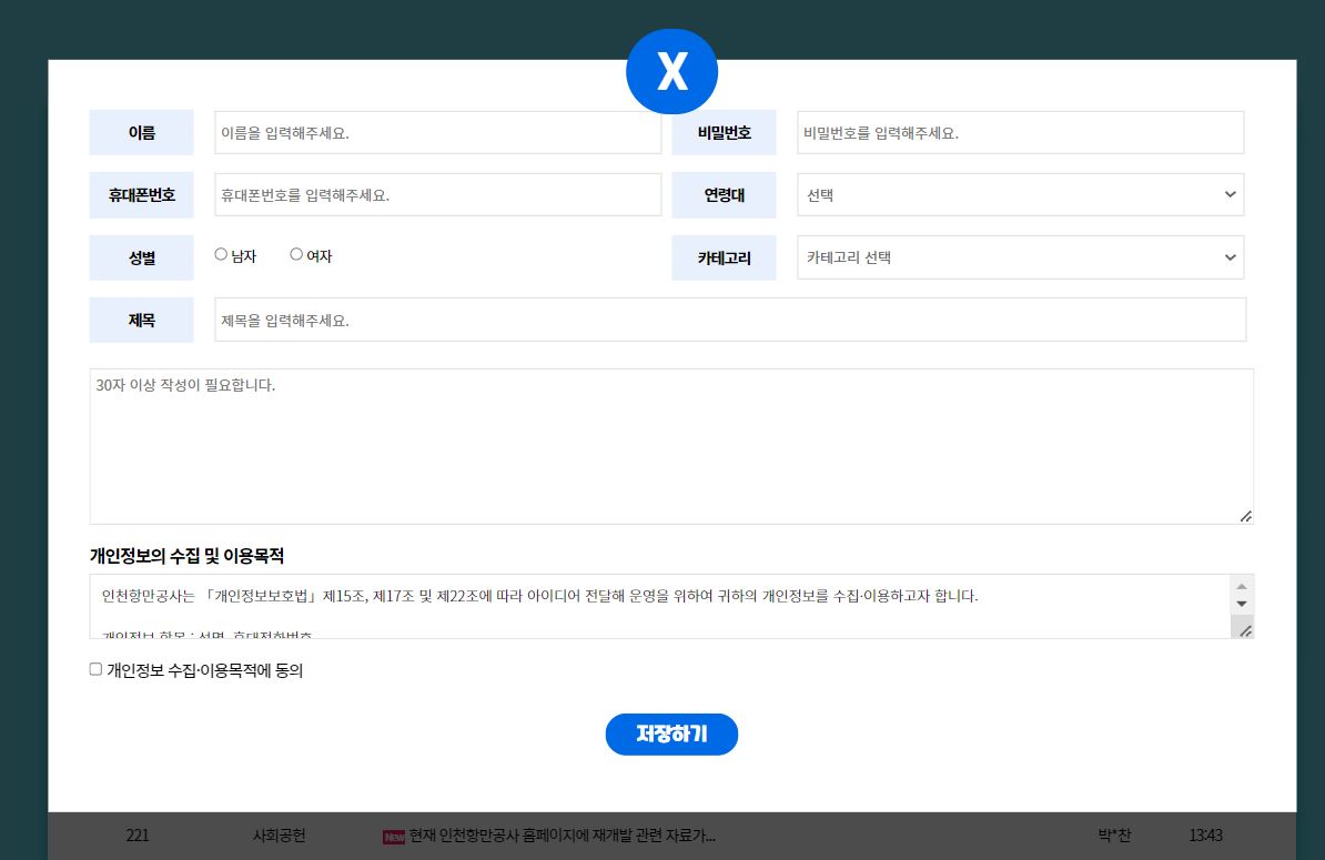 접수화면 하단에 참여하러 가기를 클릭한 후, 홈페이지 최하단에 글쓰기 버튼을 눌러 글을 작성할 수 있습니다.