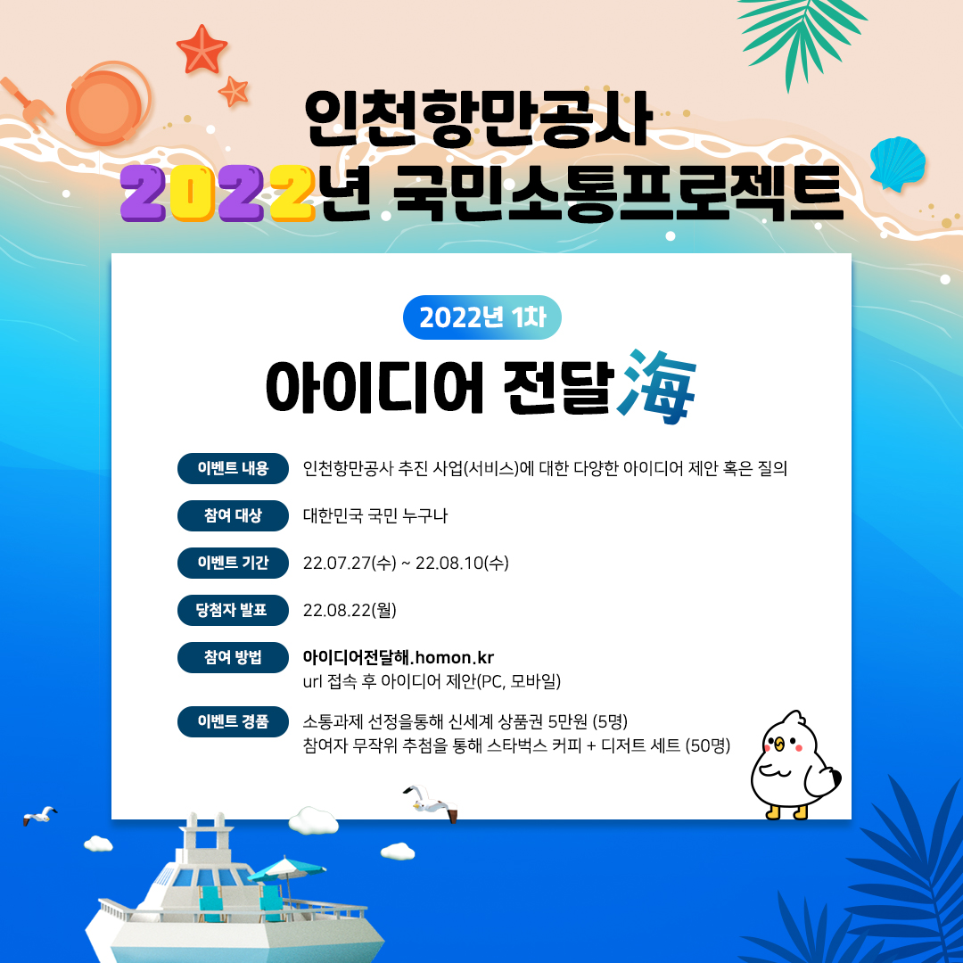 인천항만공사는 국민 참여형 과제 발굴을 위해 2019년부터 매년 ‘아이디어 전달해(海)’를 개최하며, 올해는 연 1회에서 2회로 개최 횟수를 늘리고 공감 및 댓글 기능을 추가하는 등 소통 채널의 실효성을 높이고 있습니다.