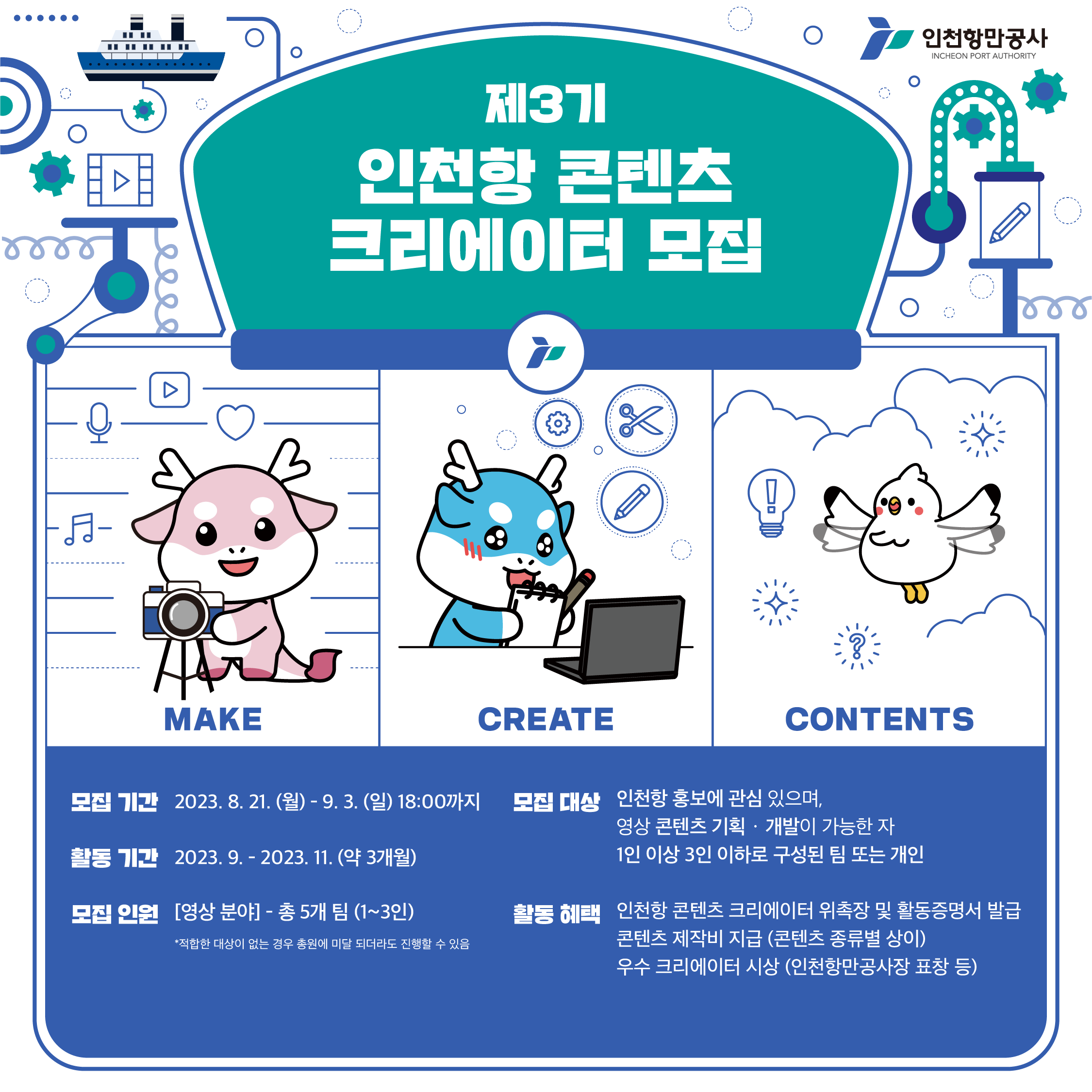 Together 2023. 8. 21. 제 3회 인천항 크리에이터 모집! 제 3회 인천항 콘텐츠 크리에이터 모집을 시작했어요! 여러분들의 많은 관심과 지원 부탁드려룡! 2022. 9. 23. [제2기 인천항 크리에이터 텍스트4팀 4-1차] 인-싸가 알려주는 최신 인천항만.ZIP 안녕하세요 ! 오랜만에 인사드리는 인-싸 요원입니다 😊 풍요로운 추석 잘 보내셨을까요? 인싸 요원도 행복한 연휴를 보내고 일상으로 돌아왔습니다! 이번 시간에는 여러분들께 조각조각 알려진 인천항만의 최신 소식을 모아모아 놓은 최신인천항만.ZIP을 열어 알려 드리겠습니다! 첫 번째 소식부터 전해드리겠습니다 ! 인천항만공사는 9월 1일 인천광역시교육청과 ‘인천형 바다학교 활성화와 미래해양인재육성’을 위한 업무 협약을 체결했습니다 ! 이번 협약을 ‘통해 해양에 대한 인식 제고 및 보전을 위한 교육 실시’ ‘해양교육 활성화를 위한 거버넌스 구축 협력’ ‘학생, 교직원, 학부모 대상 해양교육 역량 강화 실시’ 등의 다양한 교육을 추진할 예정입니다 😊 두 번째 소식은 바로 추석과 관련된 소식입니다 ! 이번 추석 연휴.. 2022. 9. 23. [제2기 인천항 크리에이터 텍스트3팀 4-1차] 크리에이터 인-싸와 함께 인천항 국제여객터미널로 가요! 안녕하세요 여러분! 무더위가 지나가고 슬슬 볼을 타고 시원한 바람이 불어오는 9월이 됐습니다! 점점 벌어지는 일교차 아래에서 모두 건강하게 잘 지내고 계실까요?! 크리에이터 인-싸는 점점 선선해지는 날씨를 느끼며 문득 나들이를 가고 싶다는 생각이 자주 들기 시작했는데요. 그래서 이번 콘텐츠는 가을 나들이와 여행을 생각하시는 분들을 위한! 인천항 국제여객터미널에 대한 정보와 인천항 국제여객터미널이 있는 송도의 따끈따끈한 핫플레이스들에 대해 소개하는 기사를 써볼까 해요! 그럼 함께 떠나볼까요?! -------------------------------------------------------------- 인천광역시 연수구 국제 항만대로 326번길 57(송도동 300-3번지)에 위치한 인천항 국제여객터미널은.. 2022. 9. 23. [제2기 인천항 크리에이터 텍스트2팀 4-1차] 해트리오 6편 _ 장용희 작가 해트리오는 쏴아- 쏴아- 들려오는 파도 소리에 귀 기울이며 다시 백사장 위에 누웠습니다. 태양이 뜨고 달이 찾아올 때쯤, 천천히 일어나 무언가 생각난 듯 해린이가 노래를 불렀습니다. 해룡이가 함께 노래를 부르고 해벗이도 흥에 겨워 날개를 활짝 펴고 춤을 추었습니다. 즉석에서 부른 노래였지만 해트리오의 노래를 듣고 감동을 받은 별들이 휘파람을 불었습니다. 그때였습니다! 달님이 긴팔을 내밀어 해트리오들을 번쩍 들어 올렸습니다. 하늘 위로 끊임없이 솟구쳐 올라 어느 섬 위에 놓아주었습니다. 그 섬은 태평양 거대 쓰레기 지대로 불리우는 쓰레기섬이었습니다. - 다음 편에서 만나요 - 2022. 9. 23. [제2기 인천항 크리에이터 텍스트1팀 4-1차] 인천항의 안전을 지켜주는 인천항 역무선 방파제 등대 매일 밤 5초마다 한 번씩 붉은색 불빛을 깜빡이며 인천항을 드나드는 선박의 안전을 지켜주는 이것. 바로 인천항 역무선 방파제 등대입니다. 역무선이란 선박의 안전한 입출항을 도와주는 예선과 도선을 말하는데, 인천항 연안여객터미널 서쪽에 위치한 길이 약 600m의 방파제가 역무선을 파도로부터 보호하기 위해 축조해서 방파제의 이름이 역무선 방파제라고 붙었고, 등대 또한 ‘인천항 역무선 방파제 등대’라는 이름이 붙게 되었습니다. 해양수산부는 역사적·조형적 가치가 있는 등대를 소개하기 위해 2019년 1월부터 매월 ‘이달의 등대’를 선정해왔고, 1998년 첫 불을 밝힌 이 등대는 해양수산부의 해양수산 어벤져스에도 선정, 이달의 등대로서 홍보되기도 했습니다. 높이 14m 홍색 원형 콘크리트 구조로 우아한 곡선과 곧.. 2022. 8. 31. [제2기 인천항 크리에이터 텍스트4팀 3-2차] 다가오는 가을 ! 인천항의 모습은 ? 안녕하세요 인천항 콘텐츠 크리에이터 인-싸요원 입니다 ! 오늘 여러분들께 말씀드릴 인천항에 관한 이야기는 바로 바로 ~ 다가오는 가을 인천항의 모습은 ? 입니다 😊 무더운 여름이 지나가기 무섭게 가을이 다가왔는데요 ! 큰 일교차에 건강 조심하고 계신가룡? 아무래도 인-싸 요원은 가을~하면 선선한 날씨에 떠나는 나들이가 생각나곤 합니다 😊 인천내항에서도 가을 나들이를 즐길 만한 곳이 있다는거 알고 계셨나요? 바로 인-싸 요원이 소개해 드리겠습니다!! 인-싸요원이 추천드리는 가을 나들이 데이트 코스는 인천내항 열린홍보관의 옥상 전망대 데이트입니다! 그런데 인천내항 열린 홍보관이 뭐냐구룡? ‘인천내항 열린 홍보관’은 인천 내항의 역사와 미래 비전을 홍보하고 주민과의 소통을 통해 항만재개발 사업의 공감대 확산을.. 2022. 8. 31. [제2기 인천항 크리에이터 텍스트3팀 3-2차] 인-싸와 함께 가봐요! 인천항 연안여객터미널 편 안녕하세요! 여러분 벌써 8월 여름이 끝이 났네요! 입추가 지나가자마자 시원해지는 날씨가 좋은 요즘, 가을 나들이가 슬슬 생각나는 시기인데요! 이 크리에이터인-싸도 시원한 콧바람을 쐬러 인천항 연안여객터미널과 연안 부두를 구경하러 가보았습니다! 그럼 크리에이터인-싸와 함께하는 연안여객터미널 나들이 함께 
